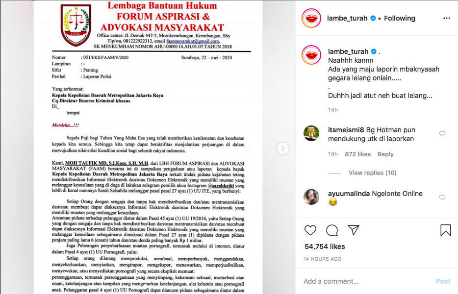 Surat laporan itu ditujukan kepada Kepala Kepolisian Daerah Polda Metro Jaya. Sarah dinilai telah melanggar Pasal 27 ayat (1) UU ITE dengan hukuman pidana paling lama enam bulan atau denda Rp1 miliar.