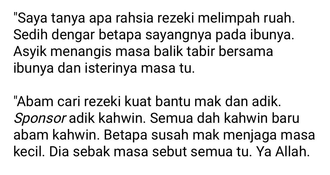 Beliau bantu keluarga, isteri, mak, adik beradiknya, bahkan beliau juga banyak sedekah pada anak-anak yatim.