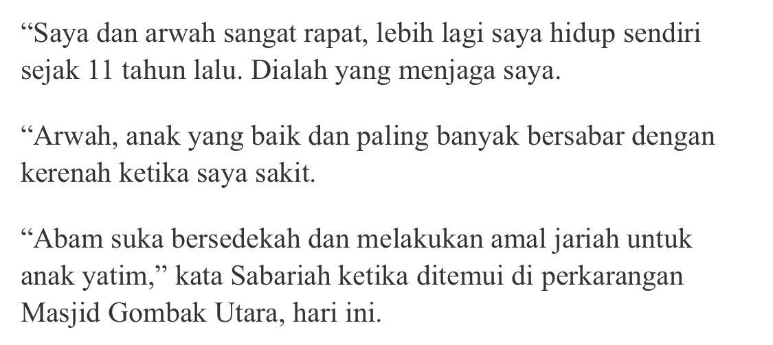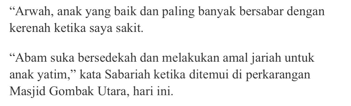 Salam takziah juga buat keluarga Allahyarham. Semoga kalian diberi kekuatan, ketabahan, kesabaran, dan moga kalian sekeluarga dikumpulkan dalam syurga firdaus tanpa hisab, insyaAllah.