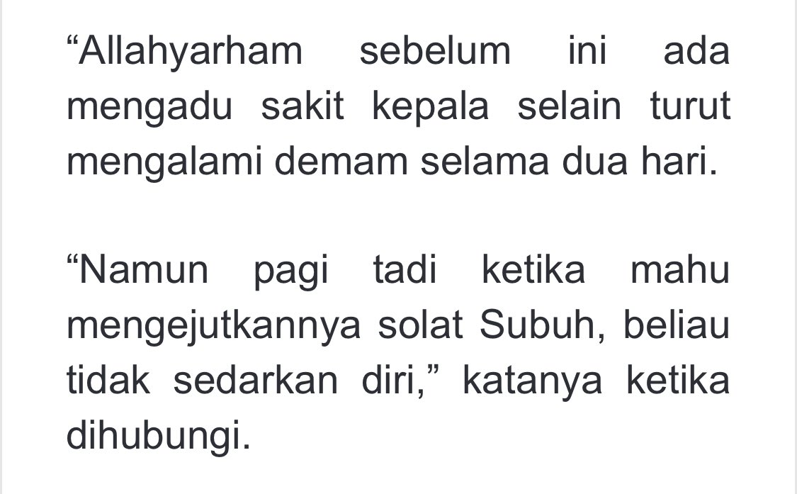 Isterinya berkata, bahawa beliau sedar akan kematian allahyarham ketika beliau sedang mengejut allahyarham solat subuh.