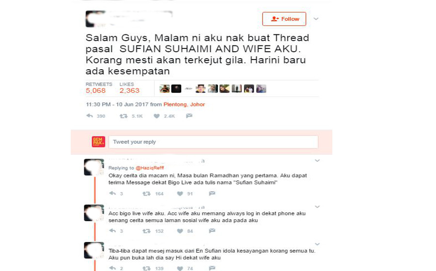 Menurut lelaki tersebut, dia terkejut apabila seorang lelaki menegur isterinya menggunakan nama Sufian Suhaimi dan menyangkakan akaun tersebut palsu pada mulanya.