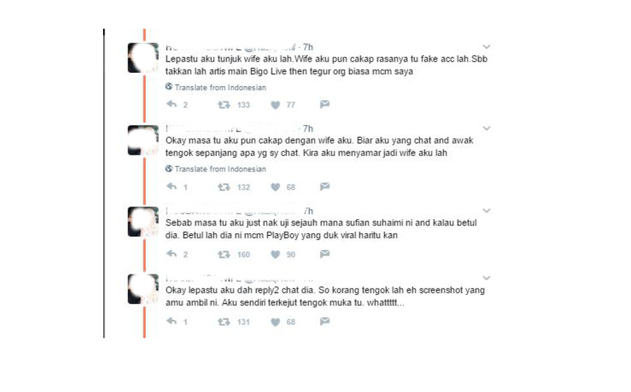 Dia mulai yakin lelaki yang berbual dengannya di laman sembang Bigo Live adalah Sufian, kerana foto-foto yang dihantar ‘asli’ dan tidak terdapat di Instagram atau di enjin carian Google Images.