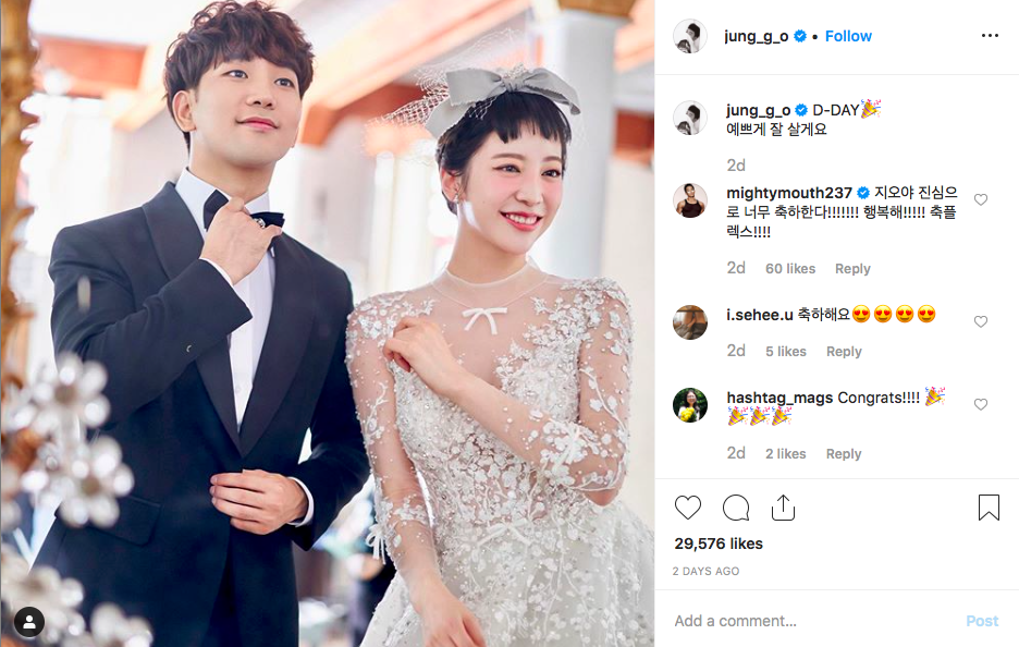 Lewat akun Instagramnya, G.O mengunggah fotonya bersama Ye seul dalam busana pernikahan pada hari mereka bernikah.