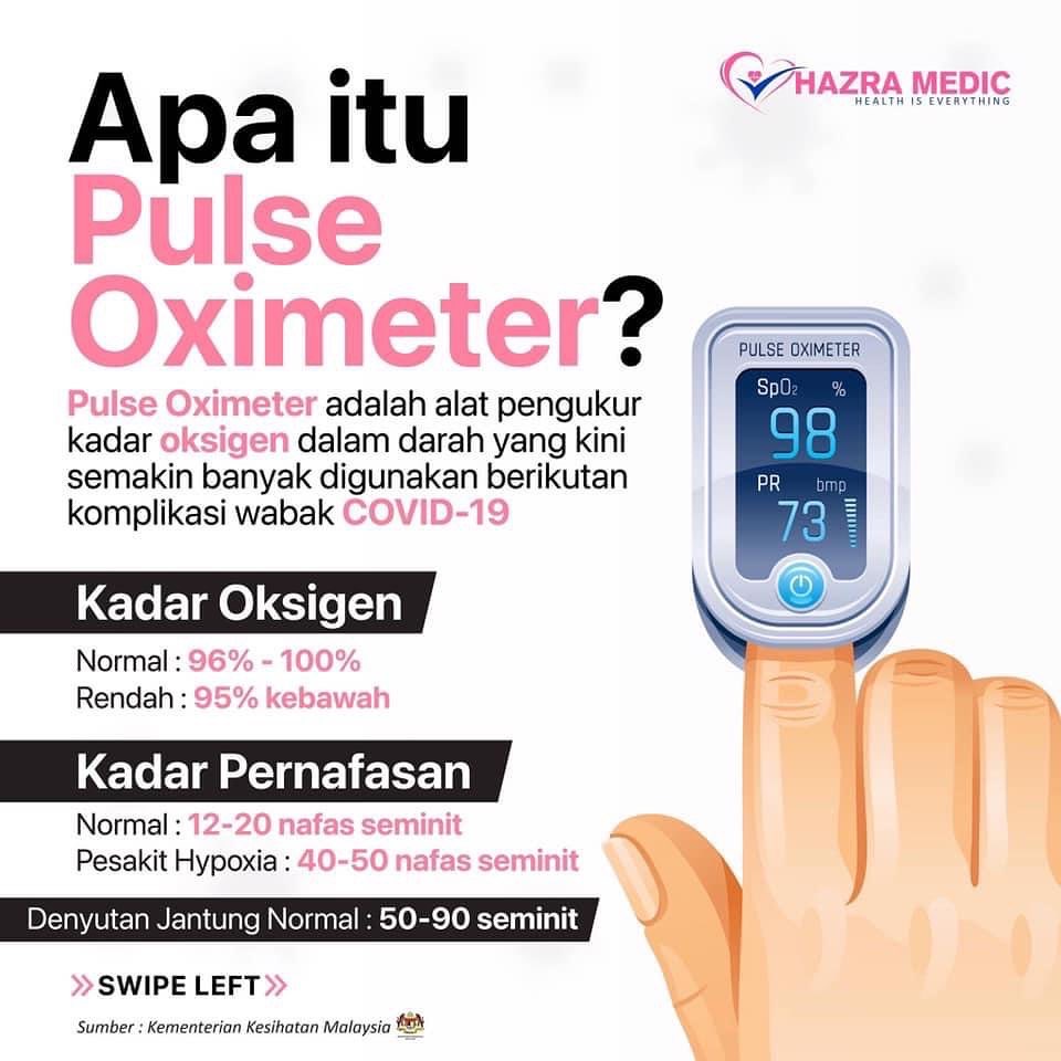 Kadar oksigen dalam badan yang normal ialah 96%-100%. Disarankan setiap isi rumah memiliki alat mengesan kadar oksigen dalam darah, 'Pulse Oximeter' atau Smart Watch supaya dapat mengesan awal penurunan oksigen dalam badan dan mengelakkan kematian.