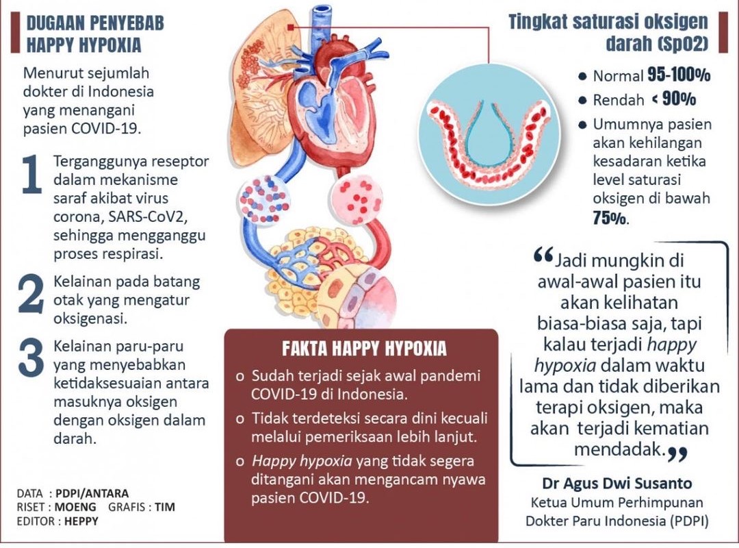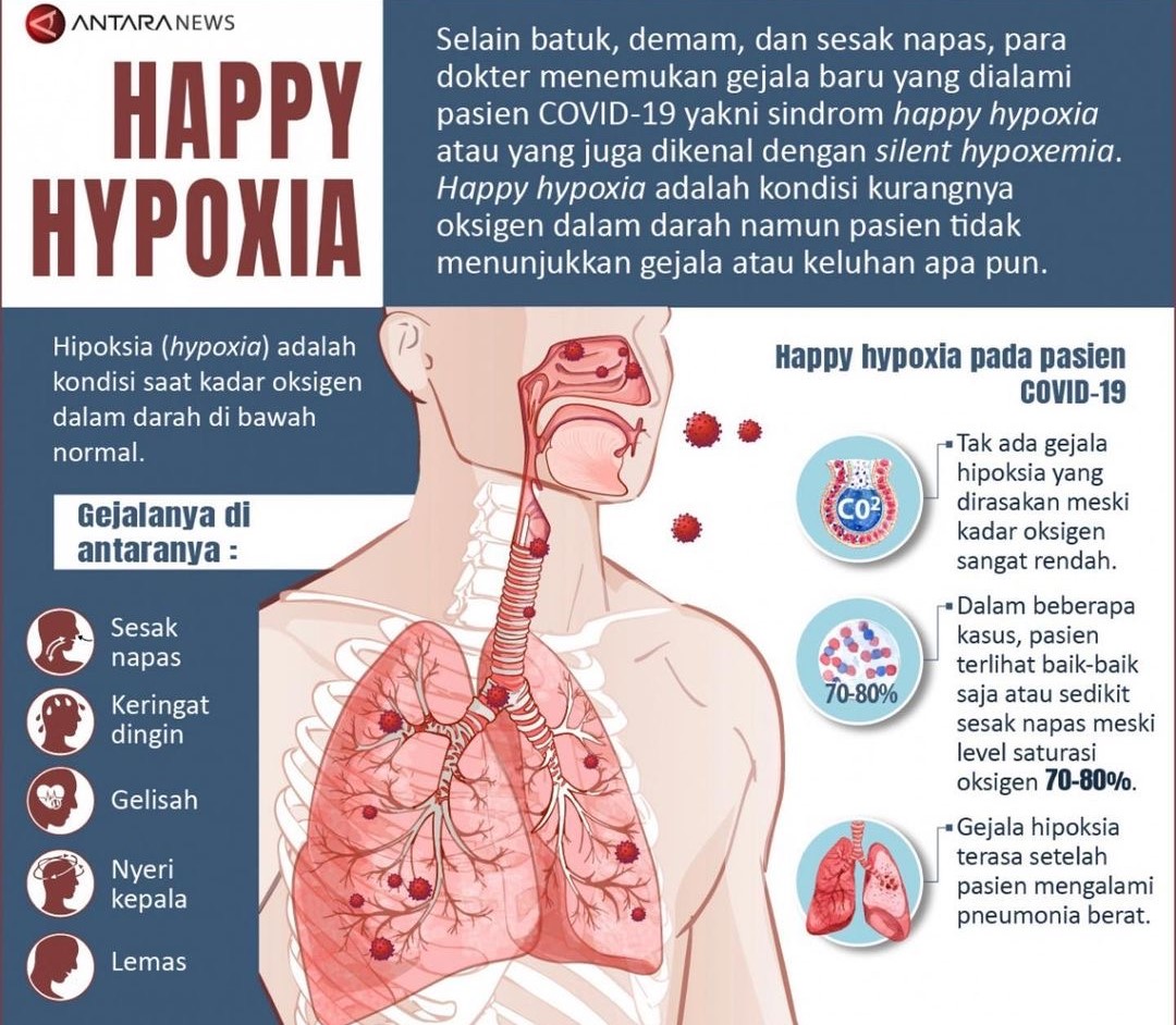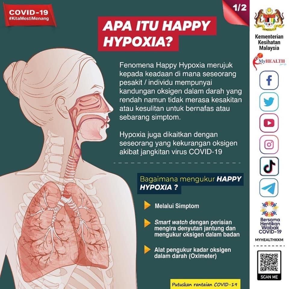 Keadaan ini dinamakan ‘Happy Hypoxia’ iaitu pesakit Covid-19 nampak ceria, normal dan tidak menunjukkan gejala sukar bernafas walaupun sebenarnya tahap oksigen dalam badan berkurangan. Kalau ‘Happy Hypoxia’ ini tidak dikesan awal, ia boleh pembunuh secara senyap.