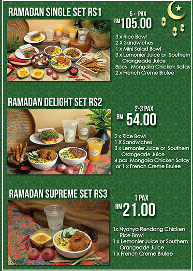 3 x Rice Bowl 2 x Sandwich 1 x Mini Salad Bowl 5 x Lemonier Juice or Southern Orangeade Juice 8pcs Mongolia Chicken Satay 2 x French Crème Brulee