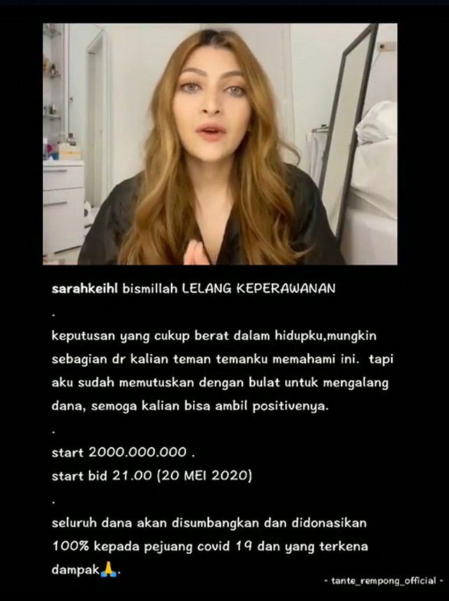 Ia pun melanjutkan dengan mengatakan: "Aku akan melelang keperawanan aku mulai dari Rp2 miliar dan 100 persen dananya akan didonasikan dan disumbangkan kepada para pejuang COVID-19 dan semua yang membutuhkan. Terima kasih. Aku harap kalian bisa ngambil positifnya."