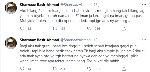 "Dalam 7000 tu ada mak ayah orang yang tengah bertarung nyawa dan ada yang meninggal.. Fikir wahai Iman Toye (Troye) apa tak tau nama hang. Tag pi kat dia nahhh," tulisnya di laman Twitter miliknya.