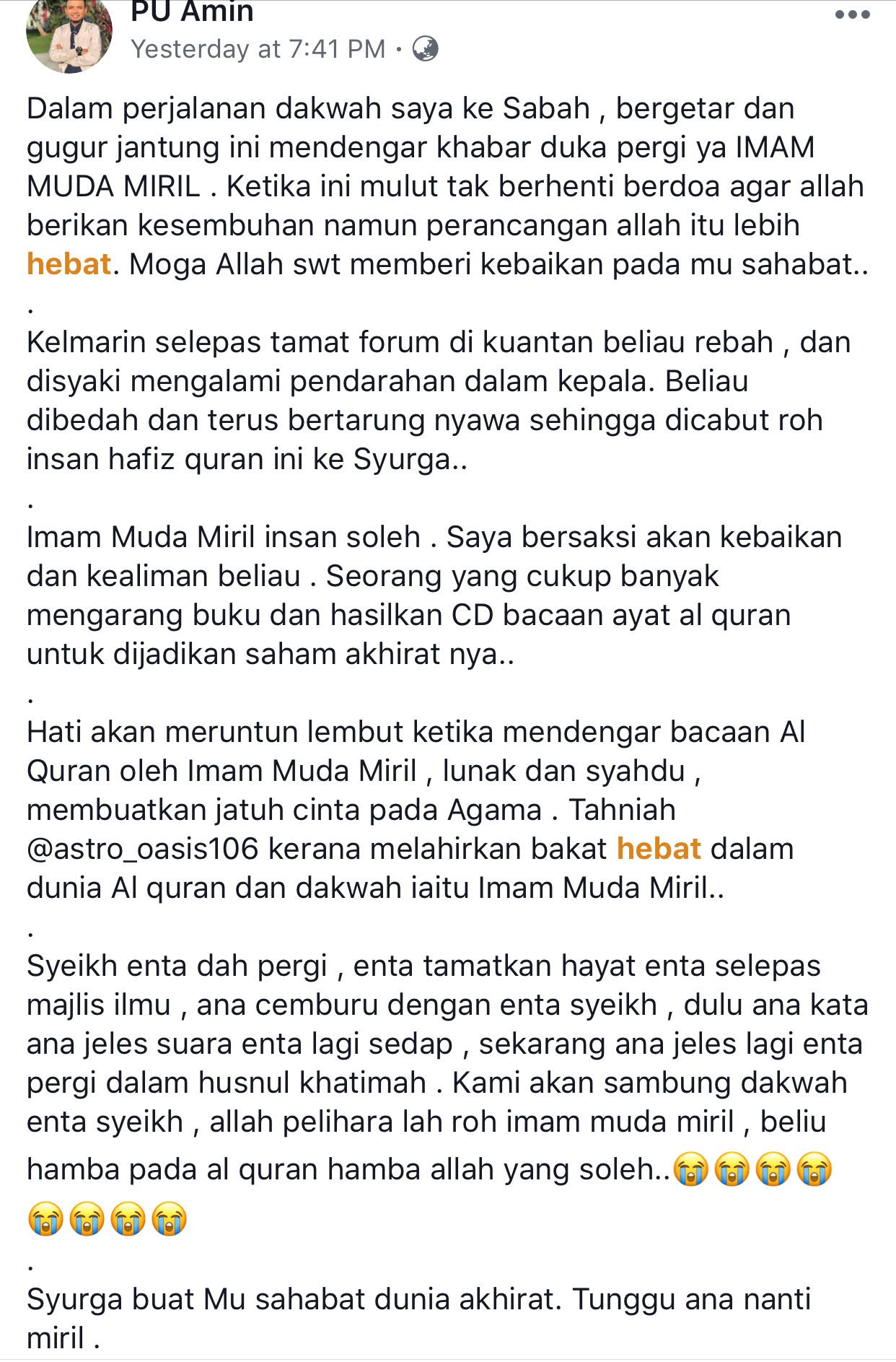 Menerusi perkongsian di Facebook, PU Amin memberitahu, mendapat berita tentang Imam Muda Miril meninggal dunia ketika dalam perjalanan dakwah ke Sabah.