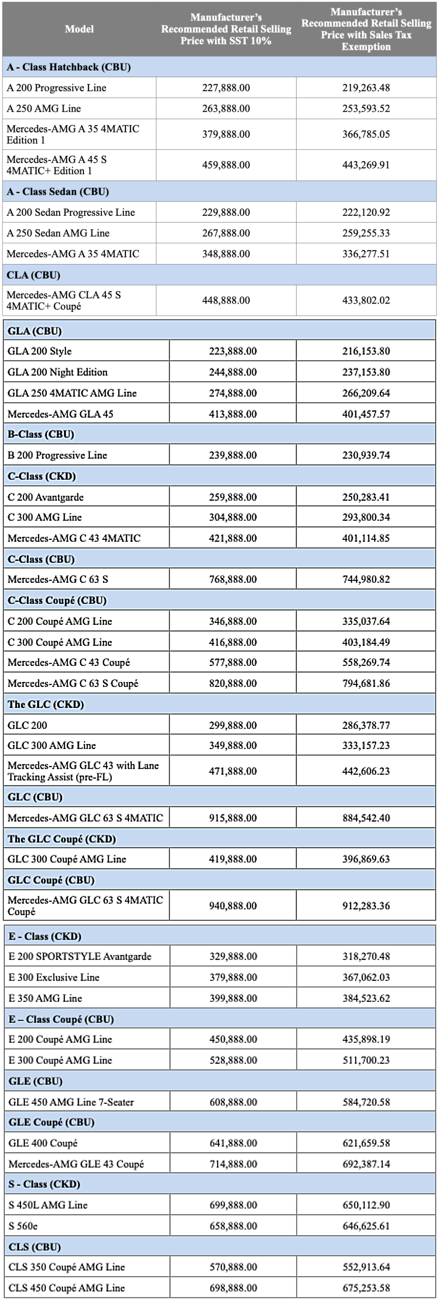 Mercedes-Benz Malaysia mengumumkan harga baharu bagi barisan model keluaranya dengan pengecualian cukai jualan 100 peratus untuk kenderaan pemasangan tempatan dan 50 peratus bagi model diimport sepenuhnya.