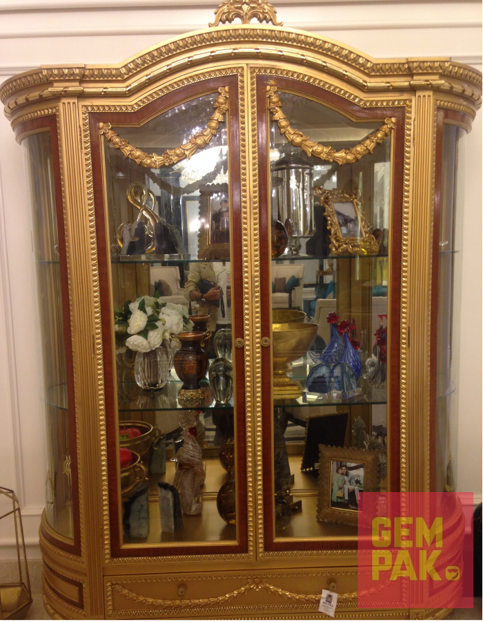 Sebuah almari berwarna keemasan digunakan untuk mengisi hiasan kaca diletakkan di sudut ruang tamu kedua kediaman ini.