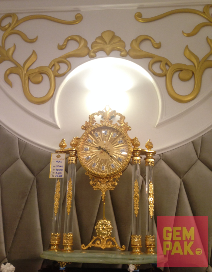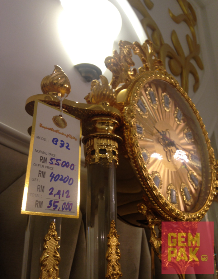 Jam hiasan gergasi ini diletakkan di salah satu ruang antara ruang tamu, masih berkonsepkan warna keemasan, jam ini merupakan produk keluaran Europe Asia Furniture & Lighthing.