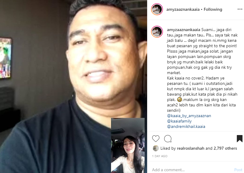 “Suami I outstation, jadi kut nampak dia kat luar ke. Jangan salah bawang pula. Kut kata pula dia pergi nikah. Maklumlah orang sekarang kan, acah-acah lebih tahu dalam kain kita dari kita sendiri,” tulisnya.