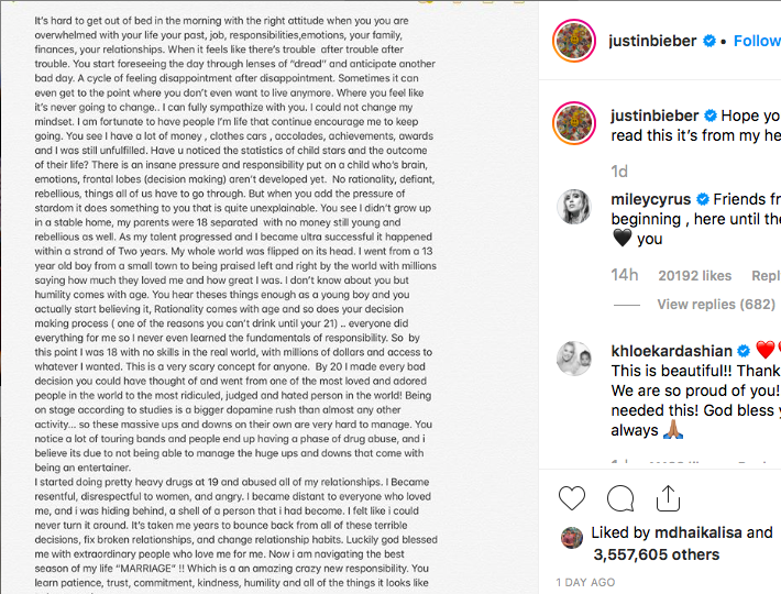 Itulah curhat yang dituliskan dengan panjang oleh Bieber lewat unggahan di akun Instagramnya, @justinbieber, kemarin (3/9/2019).
