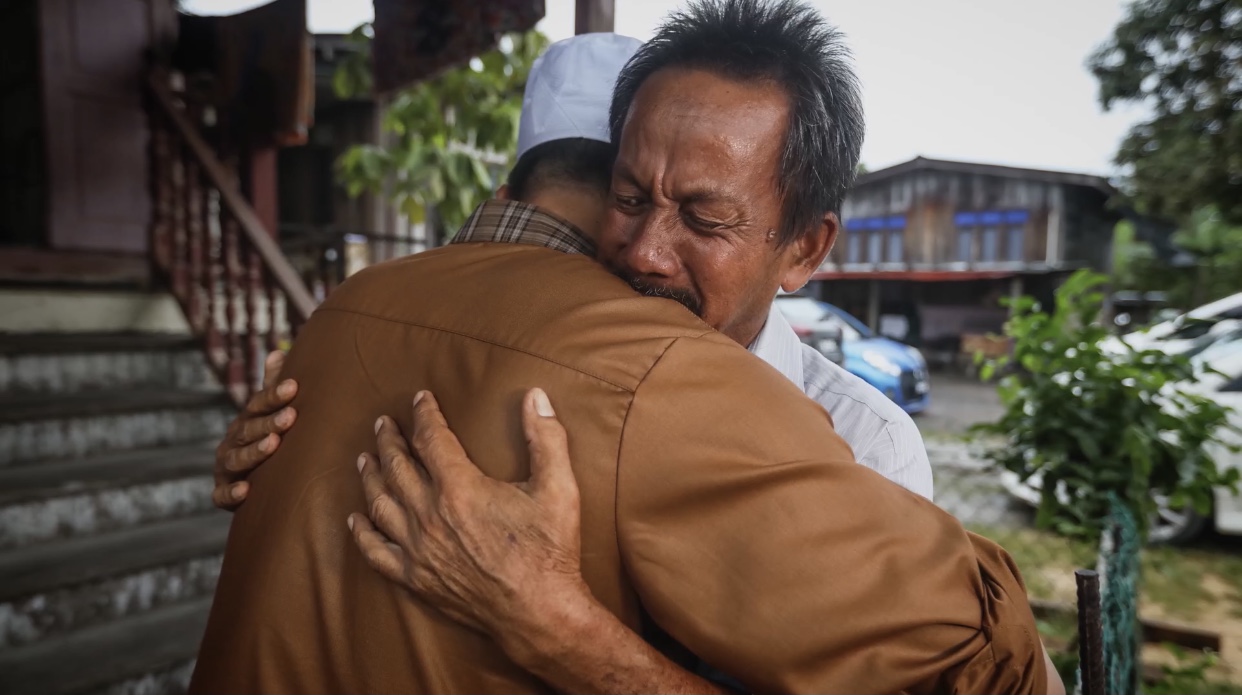 Kredit Foto: Astro PrimaSetibanya di rumah keluarga mangsa jam 9 pagi, bapa arwah memeluk erat seraya Ustaz Ebit Lew merangkul kemas tubuh si ayah yang kehilangan anaknya itu. Walaupun tidak pernah bersua muka, tetapi nyata hikmah persaudaraan sesama Islam membuatkan Ismail senang sekali menyambut kedatangan Ustaz Ebit Lew. Berat mata memandang, berat lagi bahu ahli keluarga yang memikul. Ustaz Ebit Lew menitipkan doa supaya Allah berikan kekuatan buat ayahnya, emaknya yang sakit supaya Allah beri kesembuhan. Juga untuk adik-beradik diberikan sedikit sumbangan, kata-kata semangat buat bekalan di hari mendatang.