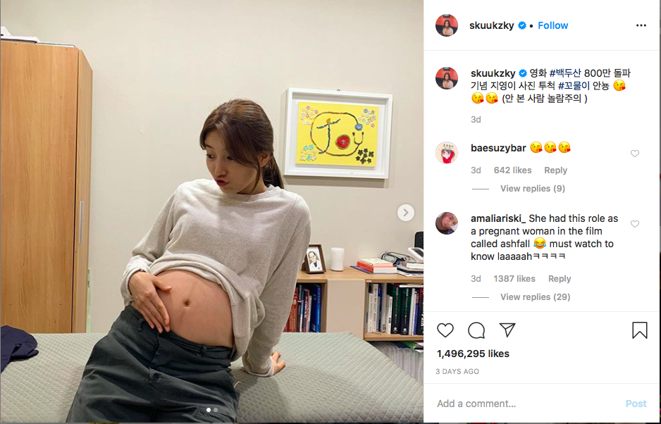 Aktris Korea Bae Suzy membikin heboh jagat maya karena mengunggah foto diri sedang hamil.