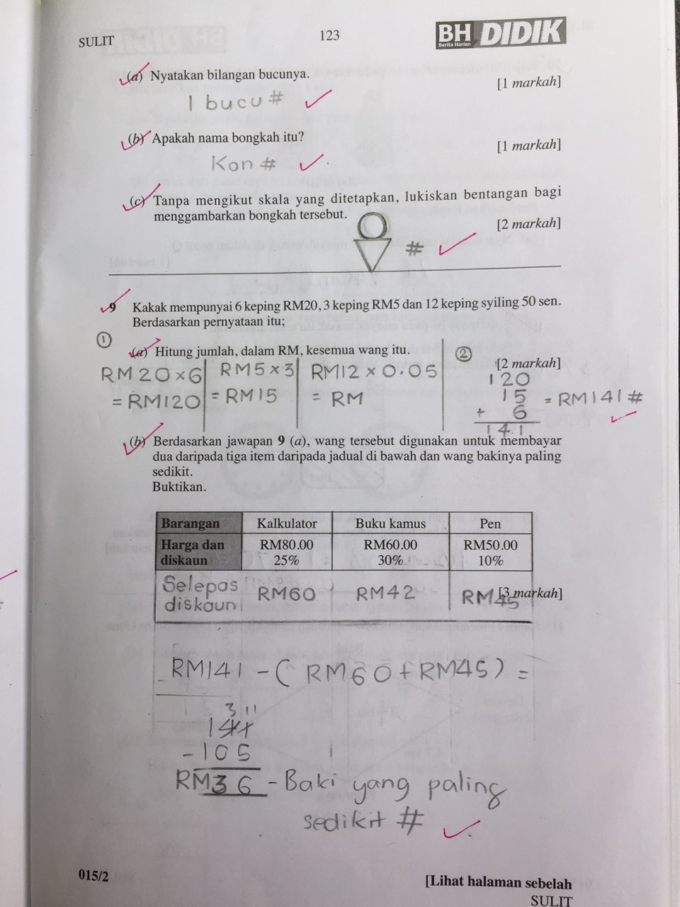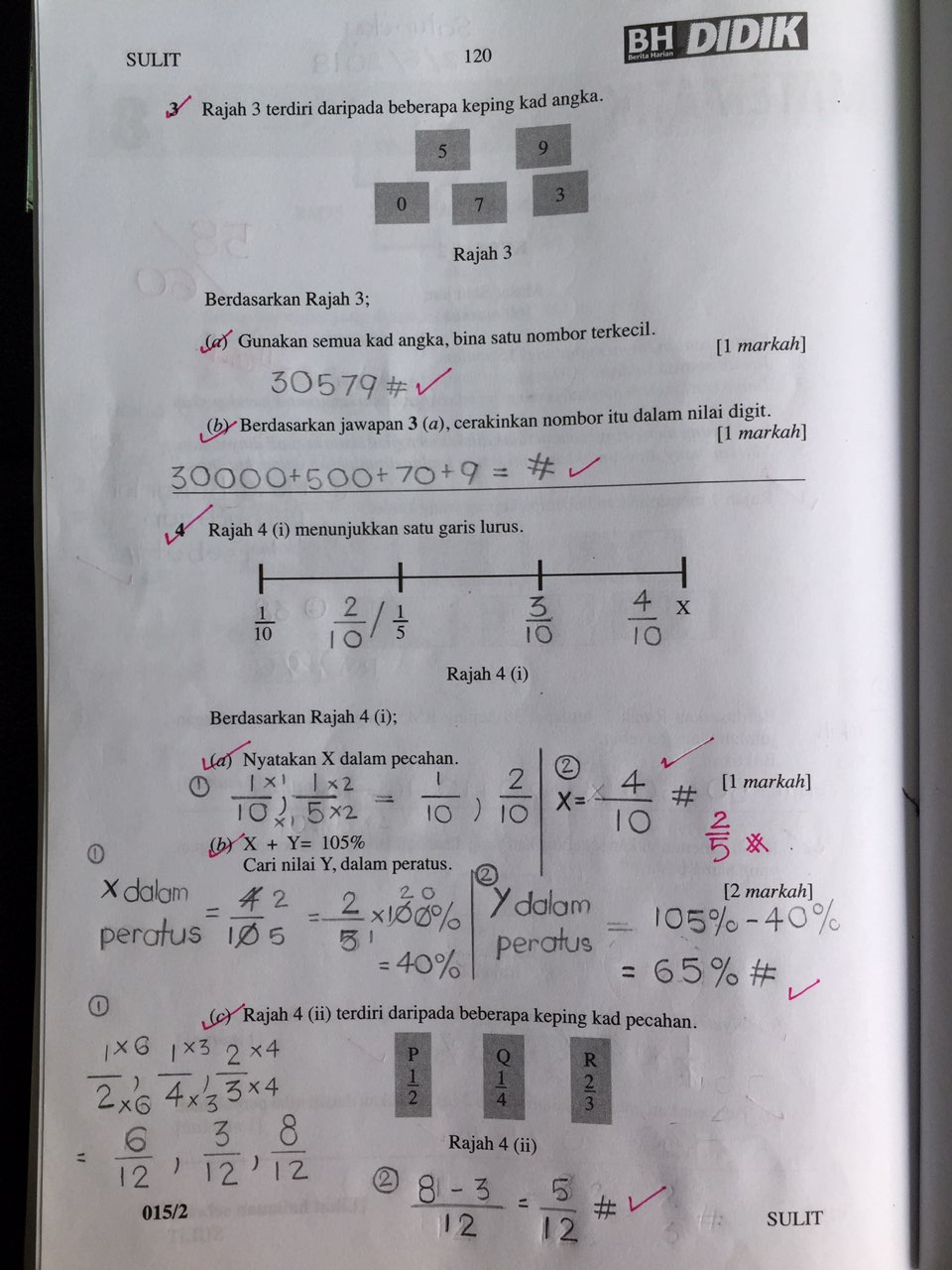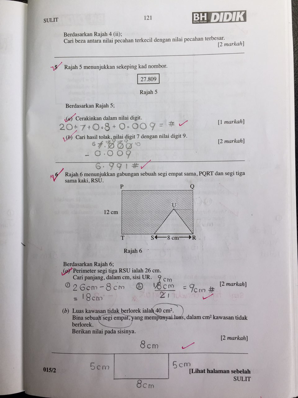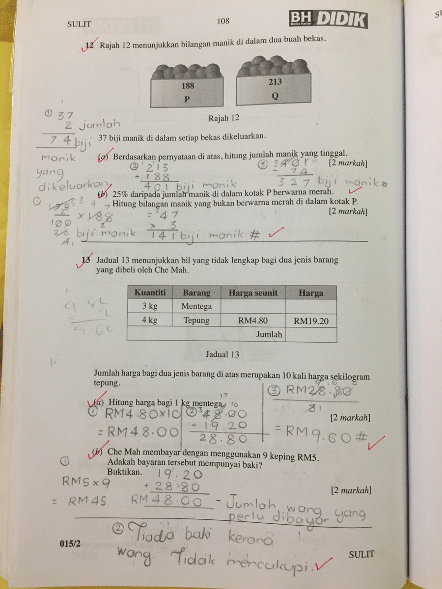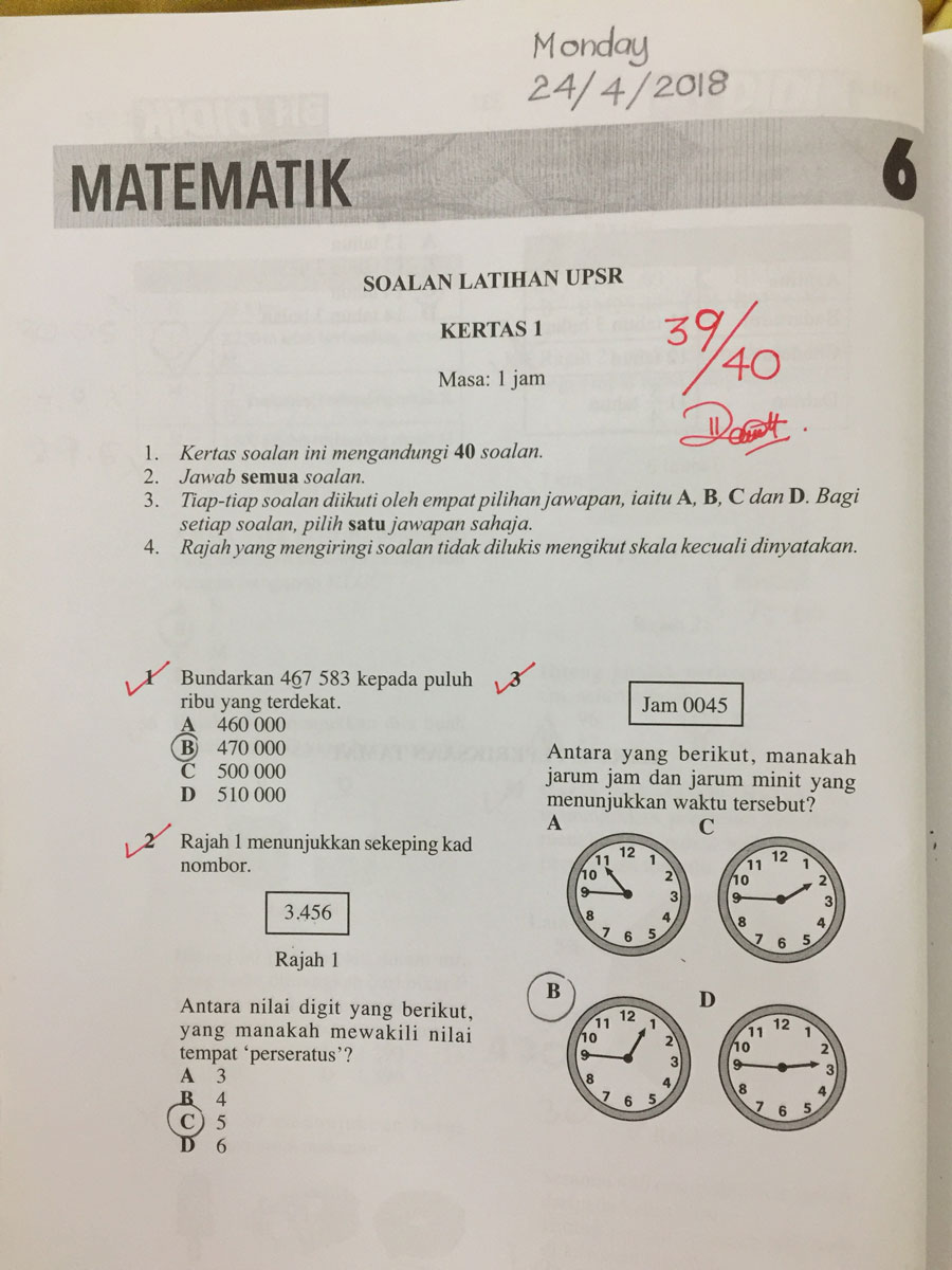 Satu tips penting, apabila menanda dan bertemu jawapan yang salah, JANGAN sekadar pangkah dan biarkan ia begitu saja. Sebaliknya, ibu atau ayah MESTI mengajak anak melihat semula mengapa ia salah. Carilah jalan kerja dan jawapan yang betul sehingga dapat.