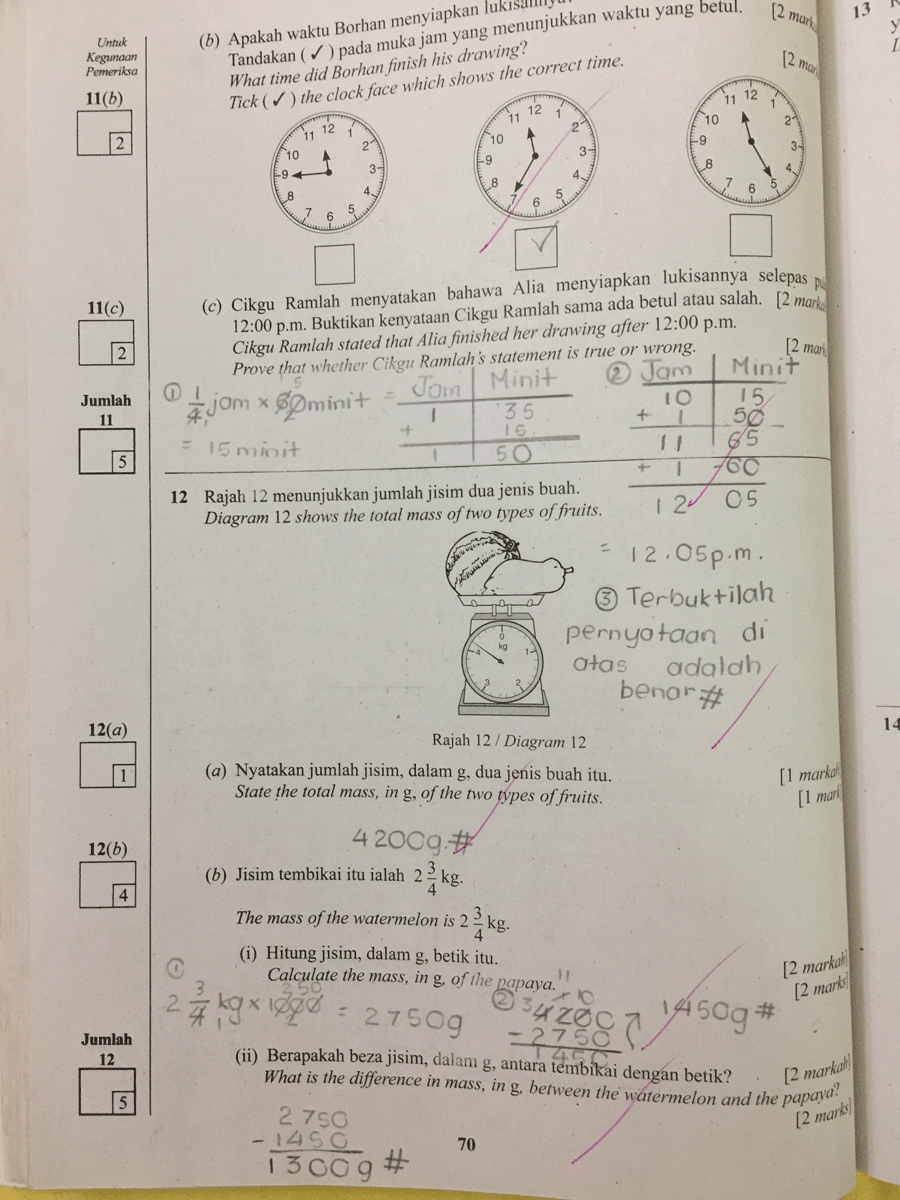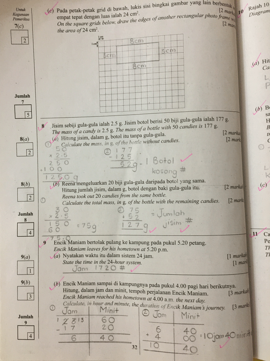 Kalau ada soalan Matematik yang melibatkan unit-unit seperti kilogram (kg), gram (gm), meter (m), sentimeter (cm), minit, jam dan sebagainya; pesanlah kepada anak-anak, pastikan ia ditukar kepada unit yang diminta dalam soalan. Anak-anak MESTI letakkan unit-unit ini dalam jalan kira penyelesaian masalah. Dan yang paling penting, ia mestilah diletakkan pada jawapan akhir. Semasa Darjah 5, Rania selalu (sangat) cuai tidak letak unit yang diminta pada jawapan akhir.