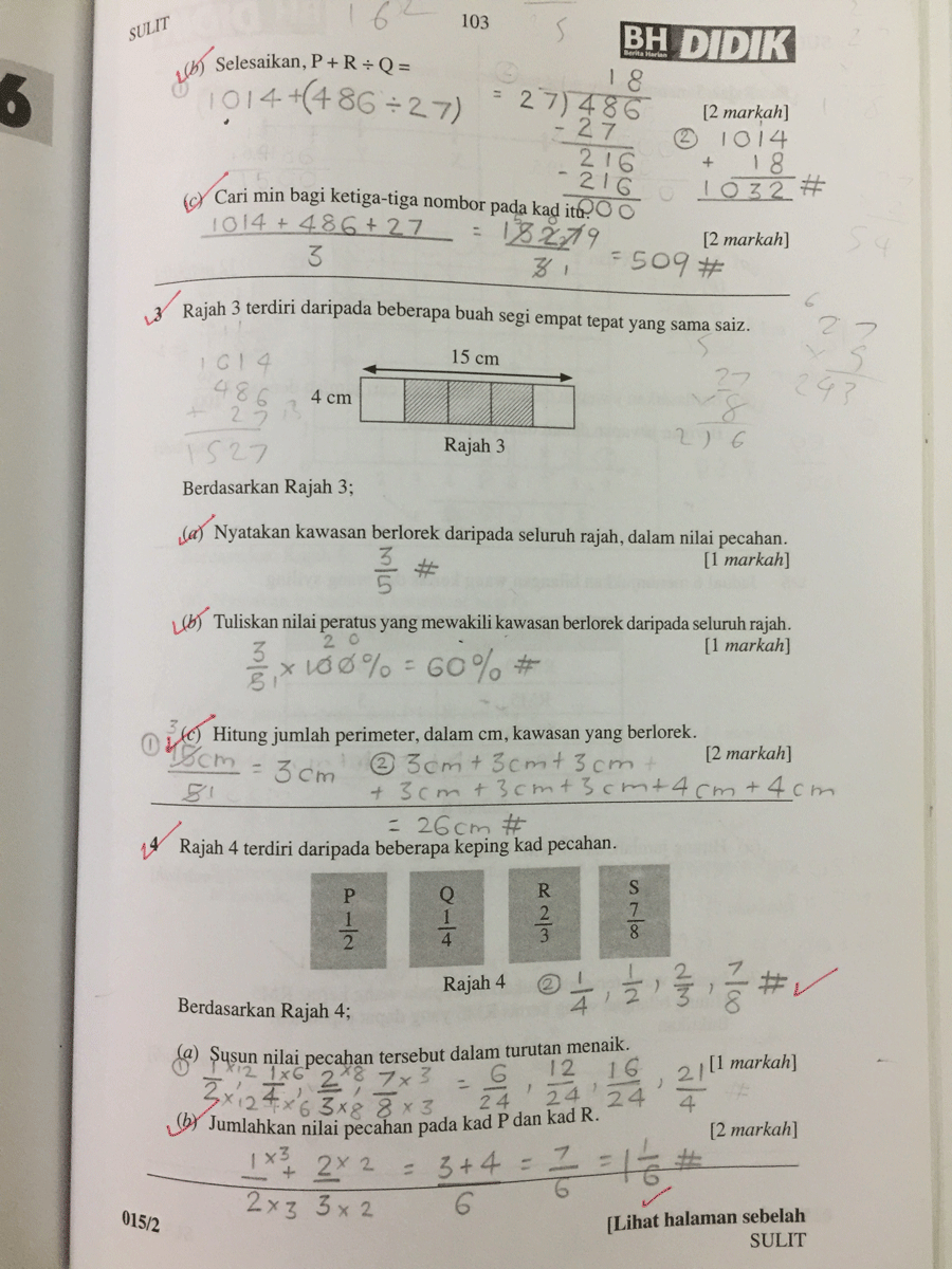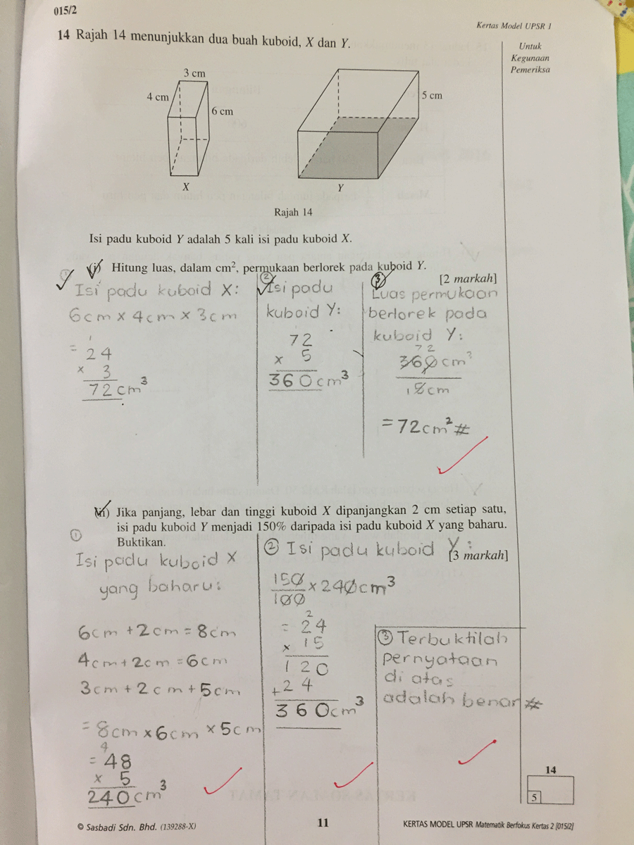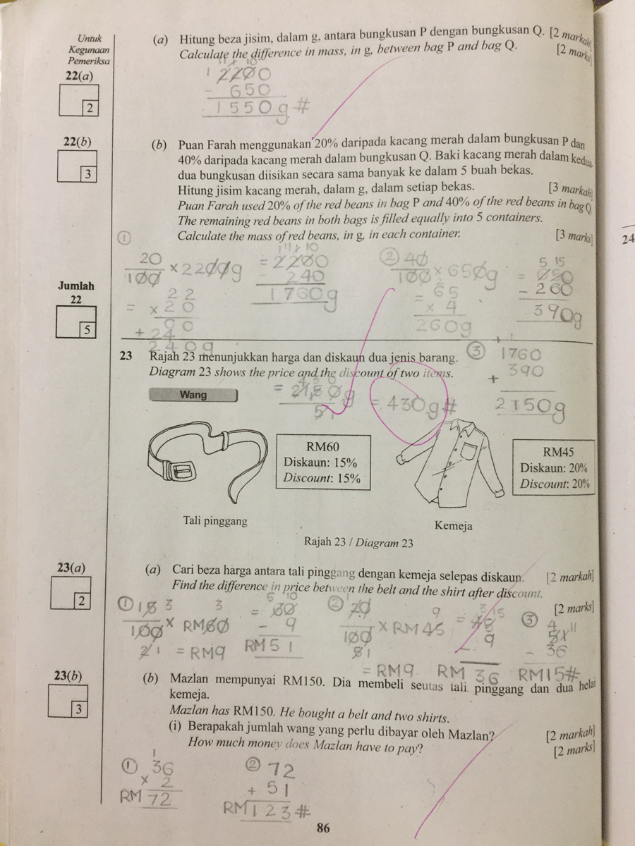 Saya pernah membawa jawapan Matematik Kertas 2 milik Rania untuk ditunjukkan kepada saudara suami — Jurulatih Utama Matematik peringkat Kebangsaan yang mempunyai pengalaman bertahun-tahun menanda kertas Matematik UPSR. Saya tanya pandangannya, "Topek, apa lagi Rania patut betulkan, supaya cuainya berkurangan?"