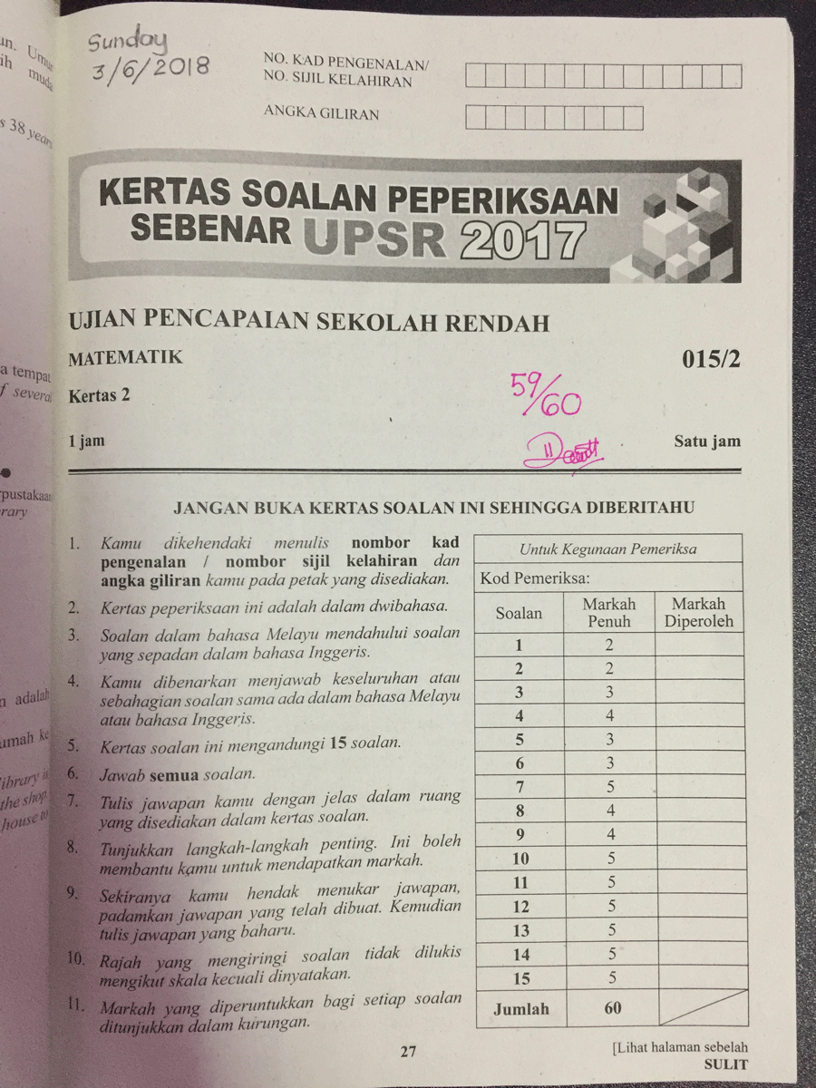 Semoga perkongsian ini berguna buat sahabat Facebook saya yang bakal menghantar anak-anak ke dewan peperiksaan UPSR tahun 2019 nanti.