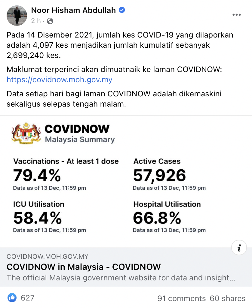 Menerusi kemas kini yang dikongsikan di laman Facebook, Ketua Pengarah Kesihatan, Tan Sri Dr. Noor Hisham Abdullah berkata, maklumat terperinci akan dimuat naik ke laman CovidNow.