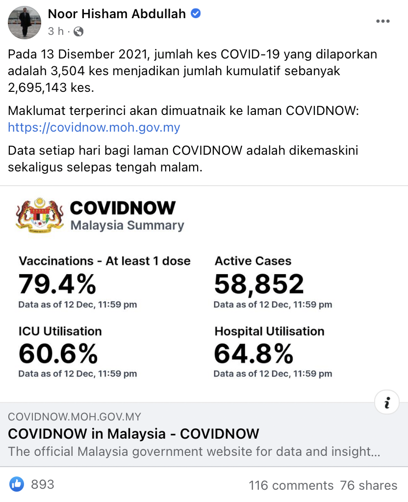 Menerusi kemas kini yang dikongsikan di laman Facebook, Ketua Pengarah Kesihatan, Tan Sri Dr. Noor Hisham Abdullah berkata, maklumat terperinci akan dimuat naik ke laman CovidNow.