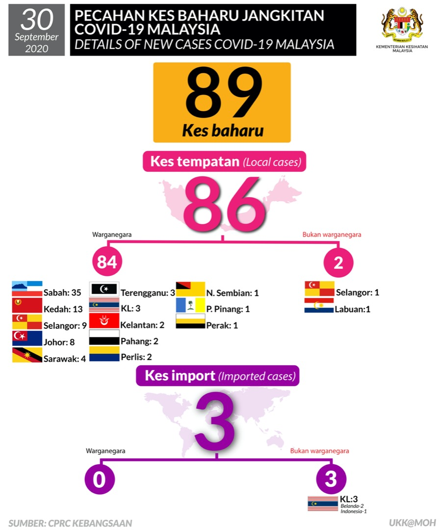 Dalam pada itu, Kementerian Kesihatan (KKM) mengesahkan 89 lagi kes baharu pada Rabu, selepas tiga hari Malaysia merekodkan lebih 100 kes pada Rabu (30 September 2020).