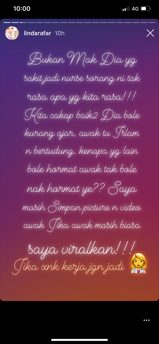 Menurutnya jika ikutkan hati dan perasaannya dia mahu menularkan wajah jururawat tersebut, namun tidak berbuat demikian kerana masih boleh bersabar.