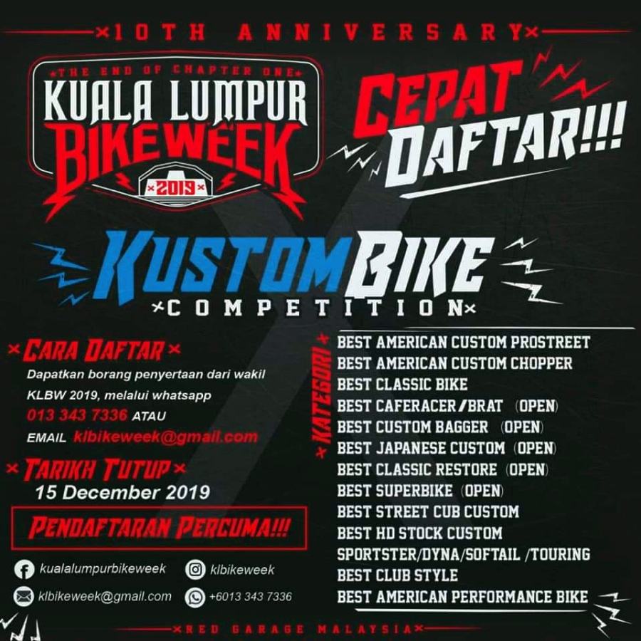 Kuala Lumpur Bike Week (KLBW) 2019 kali ke-10, sekali lagi akan menggegarkan bandaraya Kuala Lumpur pada 20 dan 21 Disember 2019 ini.