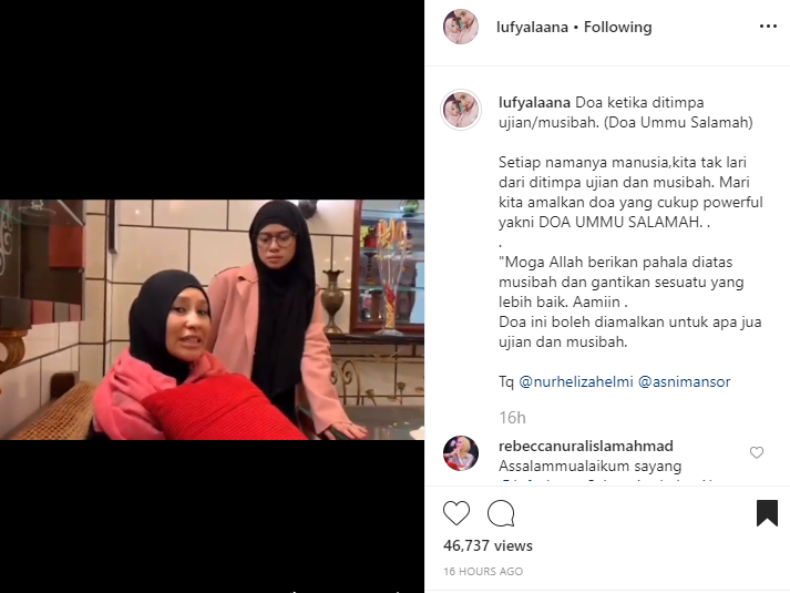 Terbaharu, Lufya menerusi akaun Instagram miliknya berkongsi rakaman video ceramah serta nasihat daripada Ustazah Asni Mansor dan Heliza Helmi mengenai doa ketika ditimpa dugaan serta musibah.