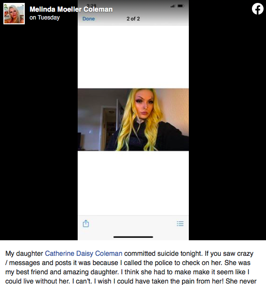 Kabar kematian Daisy dikonfirmasikan oleh sang ibunda, Melinda Coleman lewat unggahan di Facebooknya.