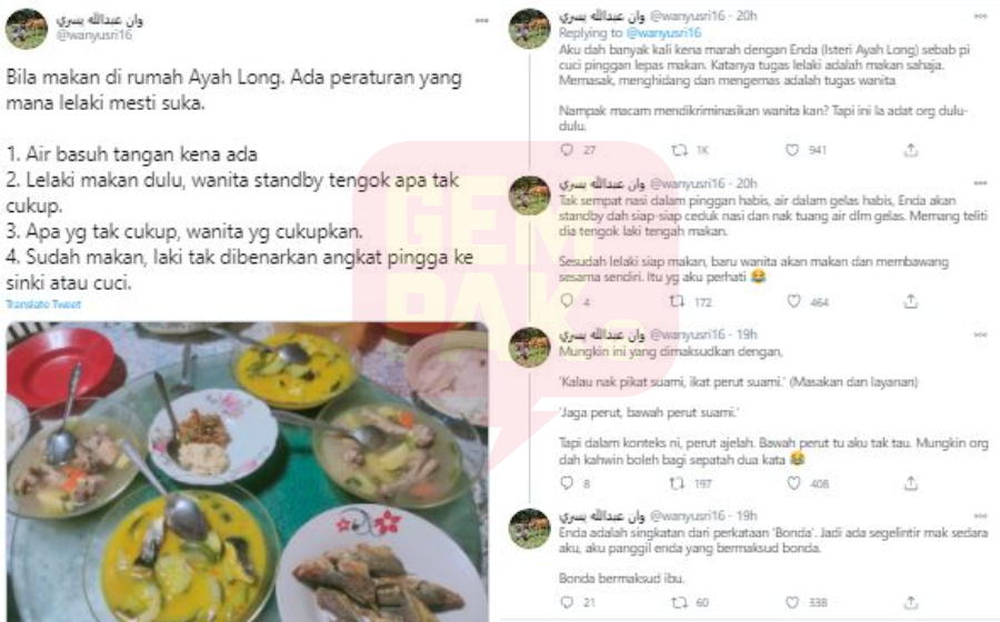 "Apa yang tak cukup, wanita cukupkan. Sudah makan, lelaki tak dibenarkan angkat pinggan ke sinki atau cuci," tulisnya.