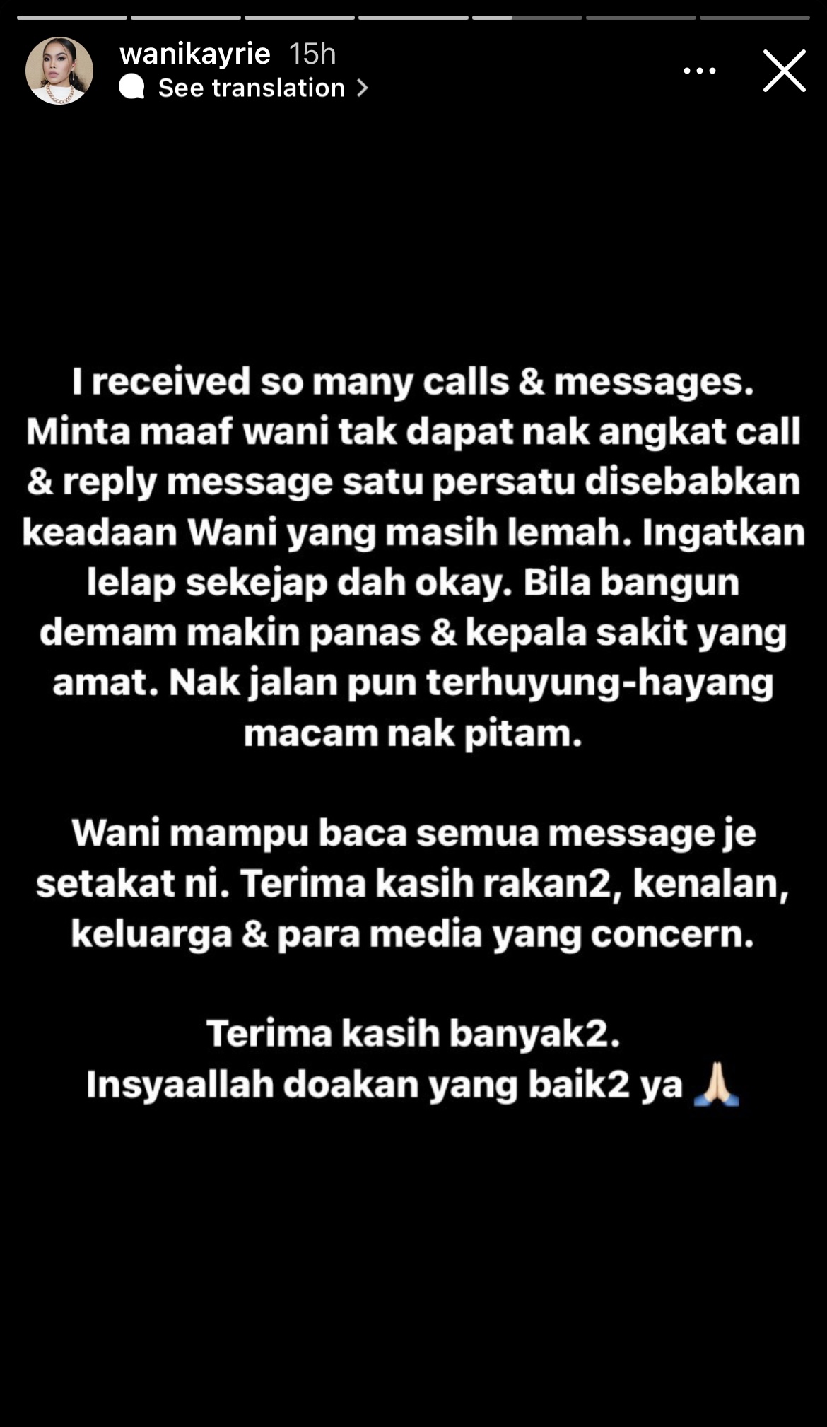 Sementara di Instagram Story, Wani memohon maaf kepada semua rakan, kenalan dan pihak media kerana masih tidak mampu membalas setiap mesej dan mengangkat panggilan setakat ini kerana keadaan yang masih lemah.