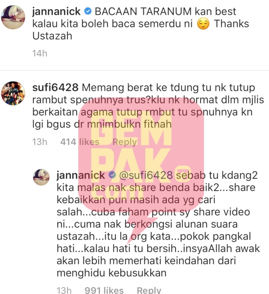 Selepas ditegur dan dikecam oleh netizen, Janna tidak berdiam diri malah tampil membalas salah satu komen pengikutnya.