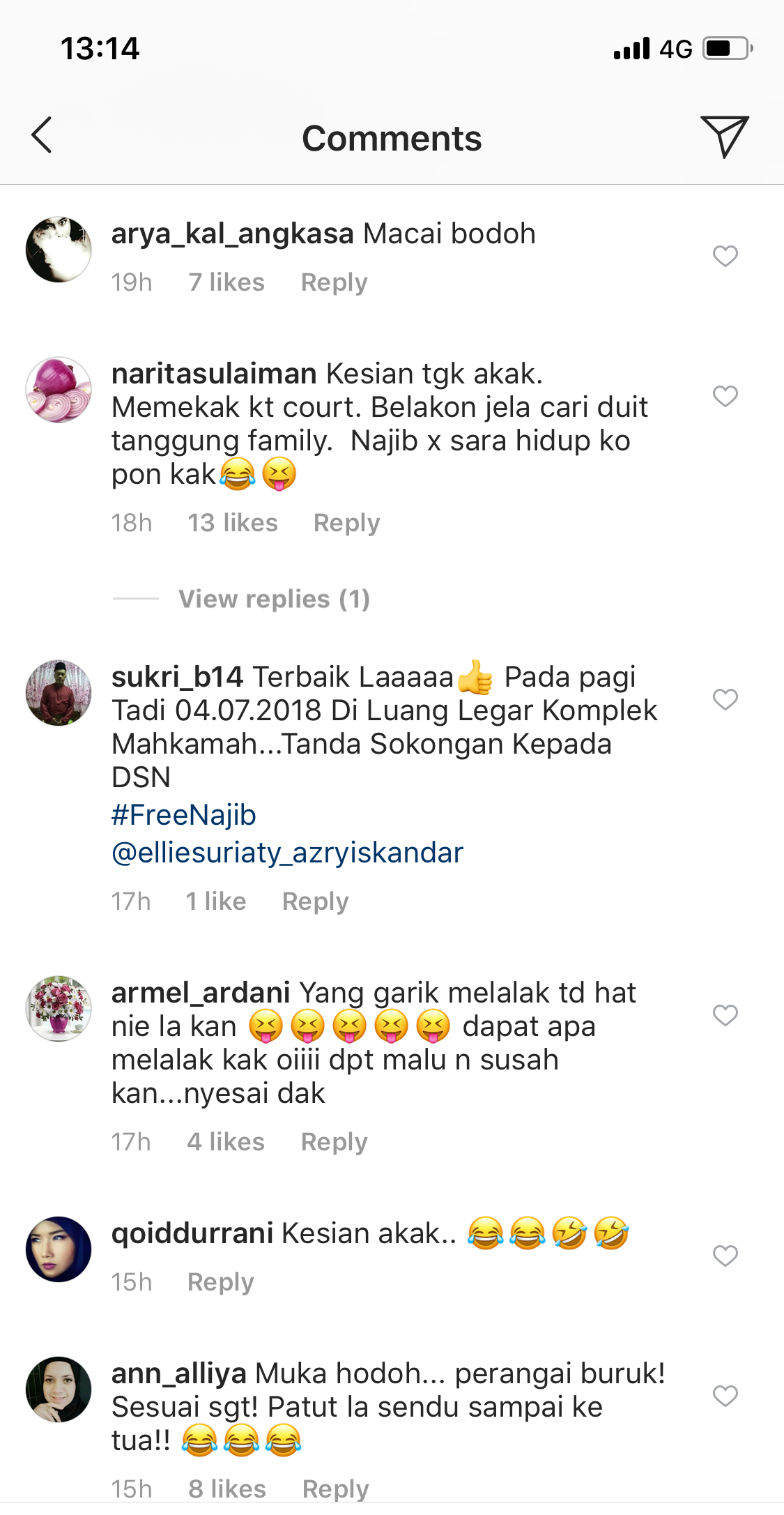 Ruangan komen Instagram milik Ellie bagai diserang oleh netizen tidak bertanggungjawab yang marah dengan tindakan Ellie menyokong Najib.