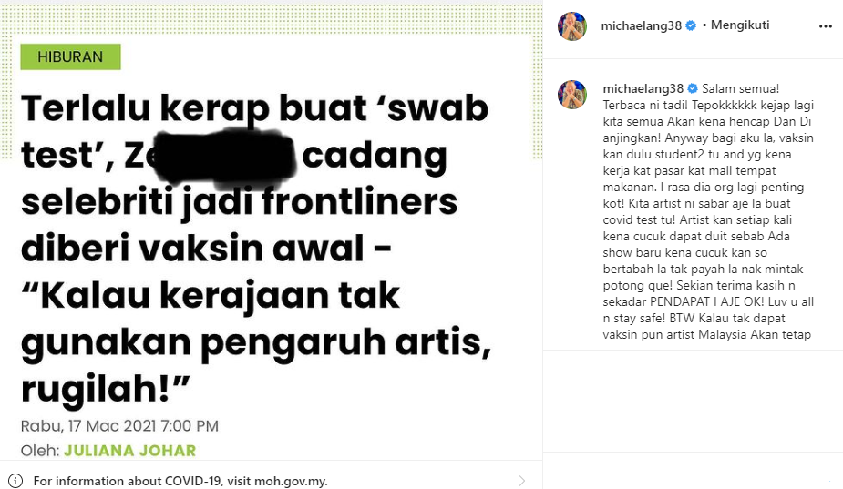 Penerbit Michael Ang tampil menyuarakan pendapat mengenai cadangan menjadikan selebriti sebagai frontliner bagi diberi vaksin lebih awal.