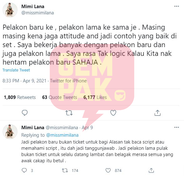 "Jadi pelakon lama pula bukan tiket untuk selalu datang lambat dan berlagak merasa semua yang awak cakap itu betul," ujarnya.