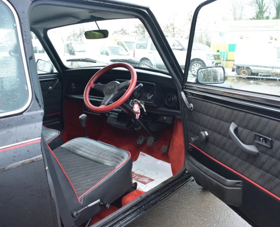 Mini berwarna hitam ini menggunakan enjin 988cc dan tiada maklumat diberikan mengenai jenis kotak gear atau spesifikasi lain.