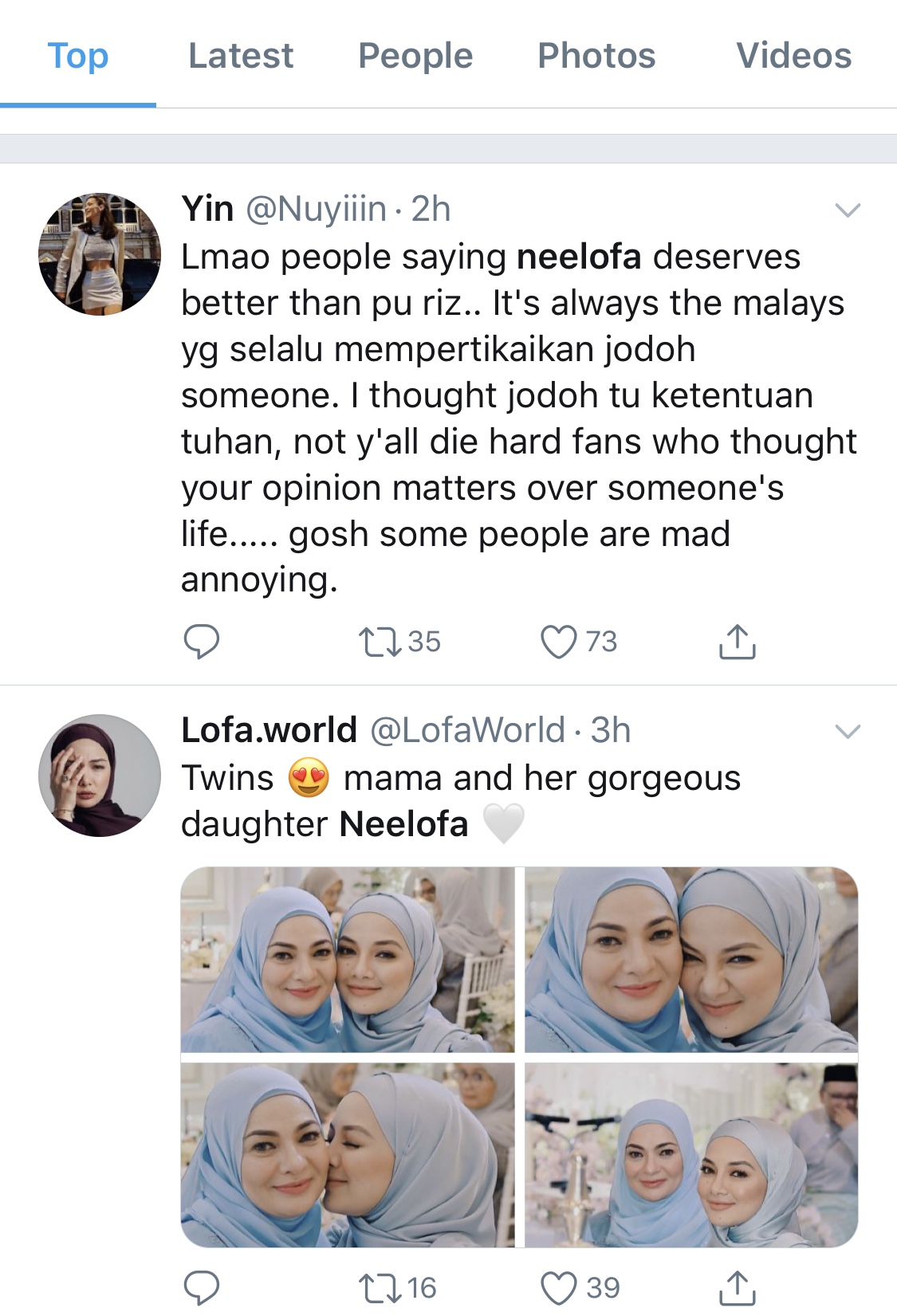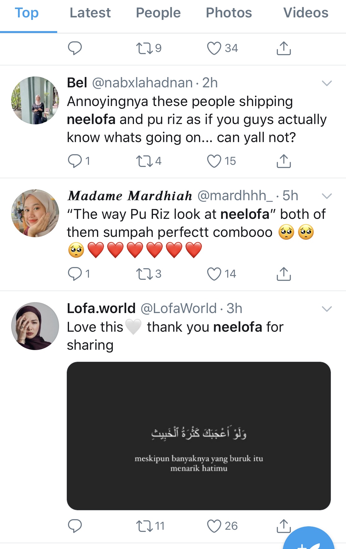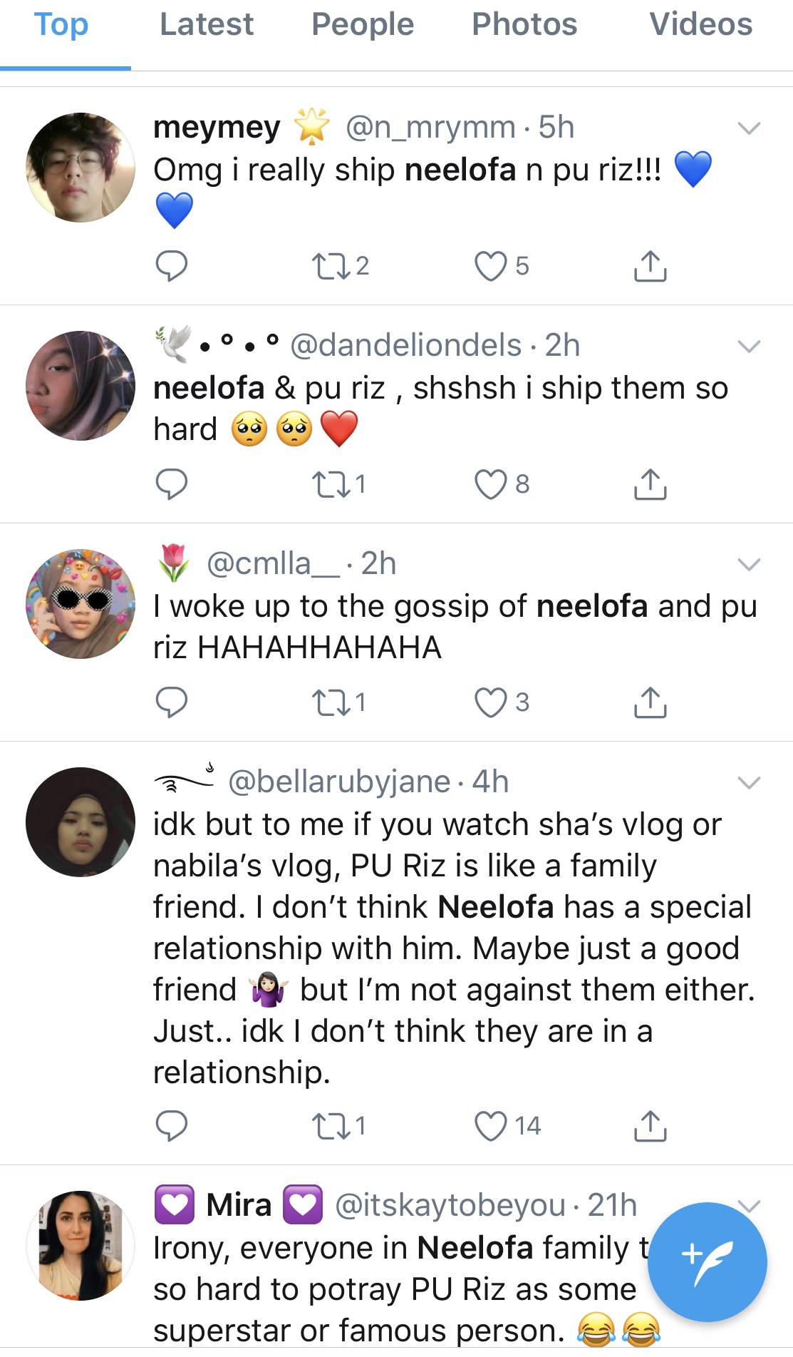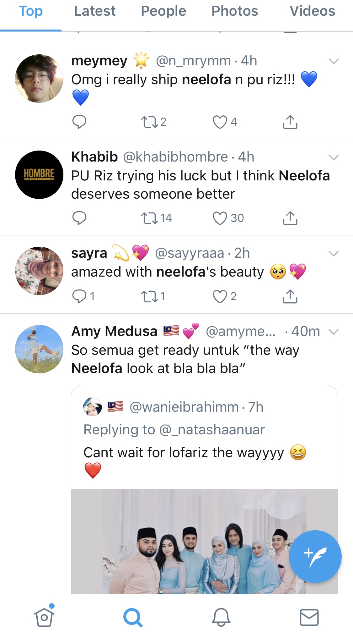 Setakat artikel ini ditulis, jumlah kicauan untuk Neelofa dan Riz di laman sosial berkenaan telah mencecah 9,024 dan 4,699 setiap seorang.