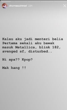 “Kalau aku jadi Menteri Belia, pertama sekali aku bawa masuk Metallica, Blink 182, Avenged Sevenfold, Disturbed..Ni Apa? K-Pop? Mak hang!,” tulisnya.