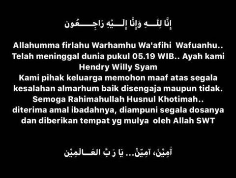 "Allahumma firlahu Warhamhu Wa'afihi Wafuanhu.. Telah meninggal dunia pukul 05.19 WIB.. Ayah kami Hendry Willy Syam," tulis Nikita Willy.