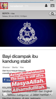 Sedangkan, bayi tersebut masih hidup dan keadaan terkini dia dilaporkan sedang kritikal.
