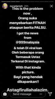 Entri IG Story terdahulu, Nora meluahkan rasa simpati kepada nasib bayi tersebut selepas ada pihak yang menyebarkan berita palsu bahawa anak kecil itu sudah meninggal dunia.