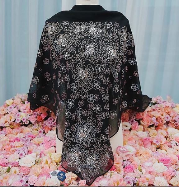Tudung bawal hitam bertatahkan kristal mewah Swarovski itu telah diserahkan kepada butik ByQiss by Bawal Exclusive untuk diberi pada pelanggan.