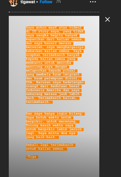 Menuliskan permohonan maafnya lewat fitur Insta Story di akun Instagramnya, @tigaawat, wanita itu juga mengaku tidak menyangka video tersebut menjadi viral sehingga dirinya sempat didatangi Kedutaan Besar Indonesia.