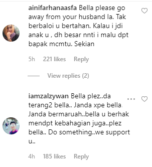 Ruangan komen Instagram (IG) Bella dihujani pelbagai komen yang mana rata-rata meminta agarnya tidak lagi bersama Aliff dan mencari kehidupan yang baru lebih baik.