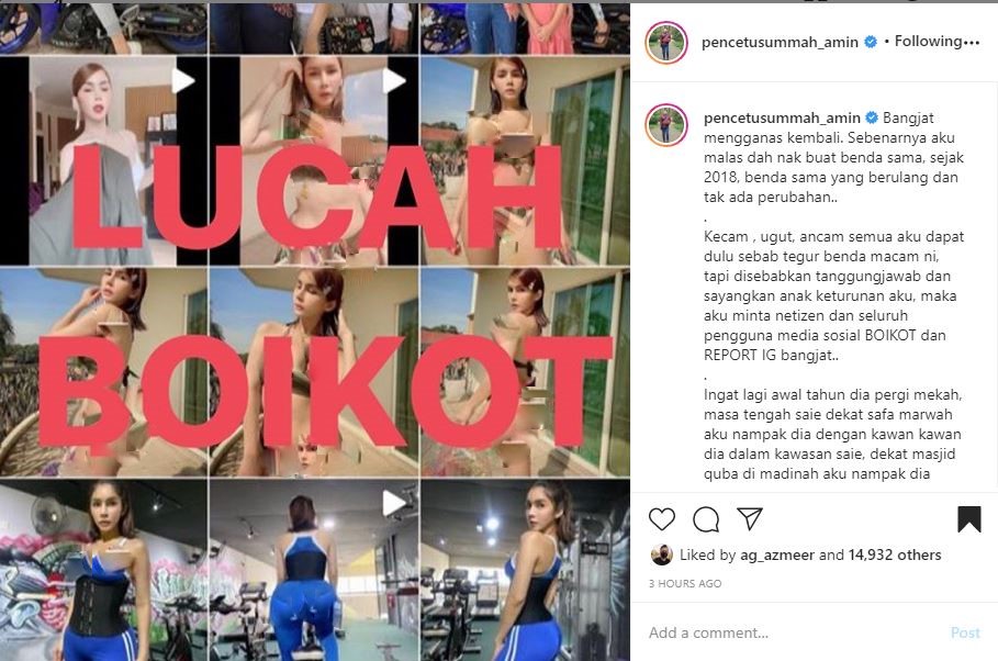 "Kecam, ugut, ancam semua aku dapat dulu sebab tegur benda macam ni, tapi disebabkan tanggungjawab dan sayangkan anak keturunan aku, maka aku minta netizen dan seluruh pengguna media sosial boikot dan report Instagram bangjat," katanya.