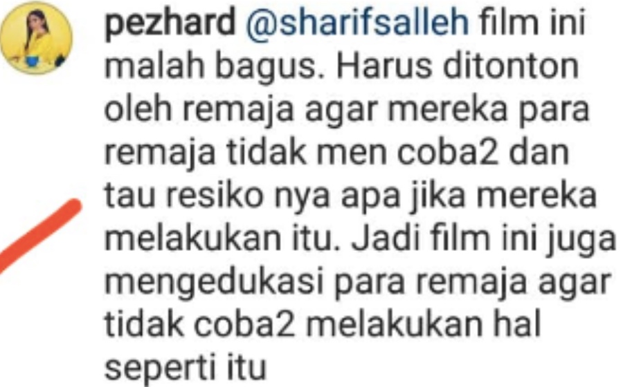 "Jadi film ini pun mengedukasi para remaja agar tidak coba coba melakukan hal seperti itu," ucap satu netizen lainnya.