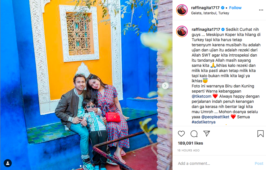 Namun, lewat salah satu unggahan di akun Instagramnya, Raffi mengatakan sudah mengikhlaskan kopernya yang hilang. Ia menganggap itu sebagai ujian dan harus intrispeksi diri.