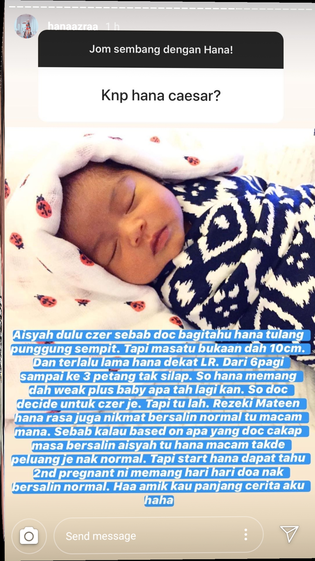 Hana berkongsi hal tersebut menerusi satu entri yang dimuat naik di Instagram Story miliknya sebagai menjawab pertanyaan netizen mengenai pengalamannya bersalin.